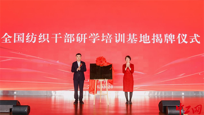 仪式上,中国纺织职工思想政治工作研究会会长邢冠蕾,青岛市市北区委副书记、区长刘新学共同为“全国纺织干部研学培训基地”揭牌。