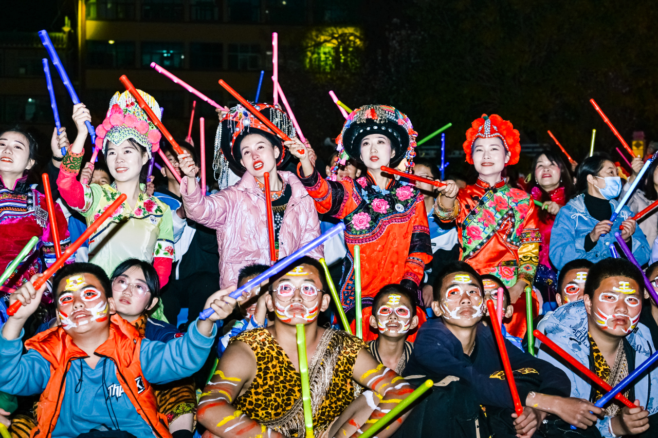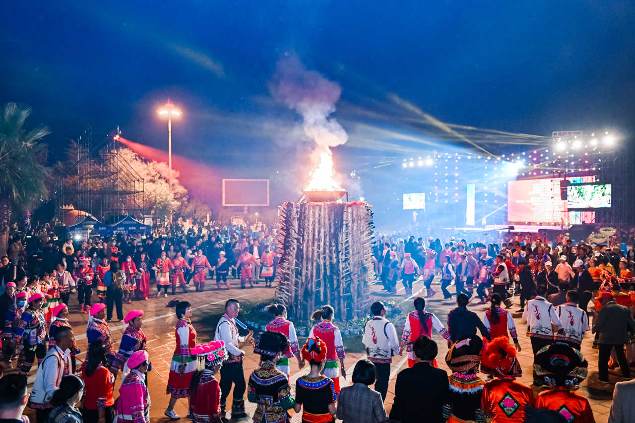以“相约虎乡大地,情牵秘境双柏”为主题的中国·双柏2023虎文化节于3月17至19日在云南省楚雄彝族自治州县举行。夜幕降临,高高的火堆被点燃,虎乡儿女身着节日盛装,围着篝火,伴着悦耳的三弦声,唱着“啊乖佬”踏歌起舞。