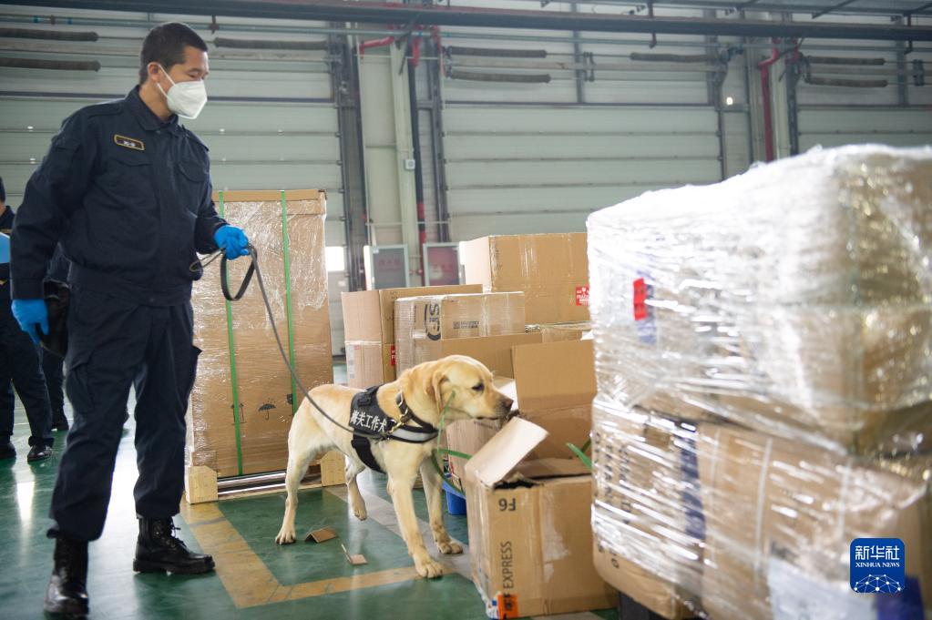 3月20日,首都机场海关关员使用检疫犬在海关监管的快件仓库查验快件。新华社记者 陈钟昊 摄