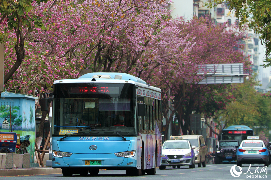 厦门禾祥西路沿街居民推窗可见满目春花。人民网 陈博 摄