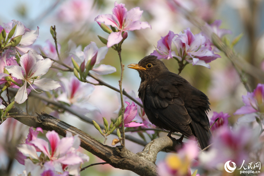 厦门南湖公园中,一只乌鸫在宫粉羊蹄甲枝干上梳理羽毛。人民网 陈博 摄