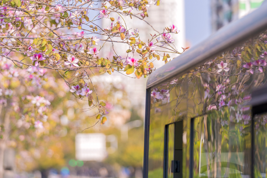 公交车驶过厦门湖滨北路,粉色的花朵映在车窗上。许秋珩 摄