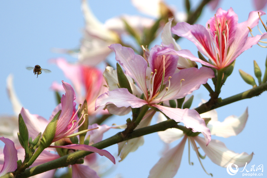 蜜蜂在宫粉羊蹄甲花朵间飞舞。人民网 陈博 摄