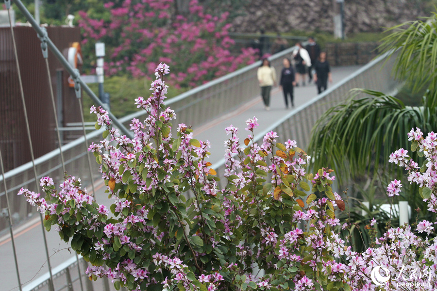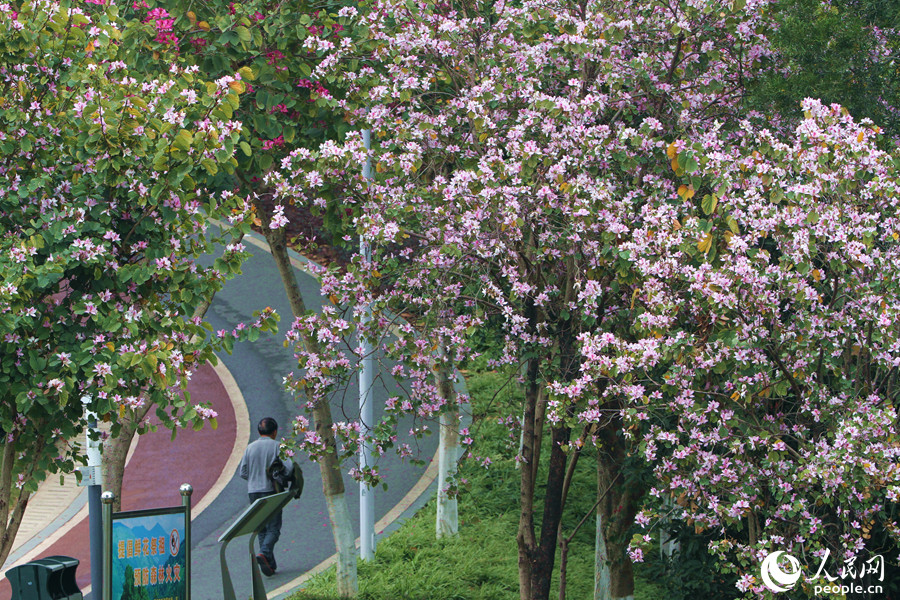 厦门山海健康步道旁,宫粉羊蹄甲花朵缀满枝头。人民网 陈博 摄