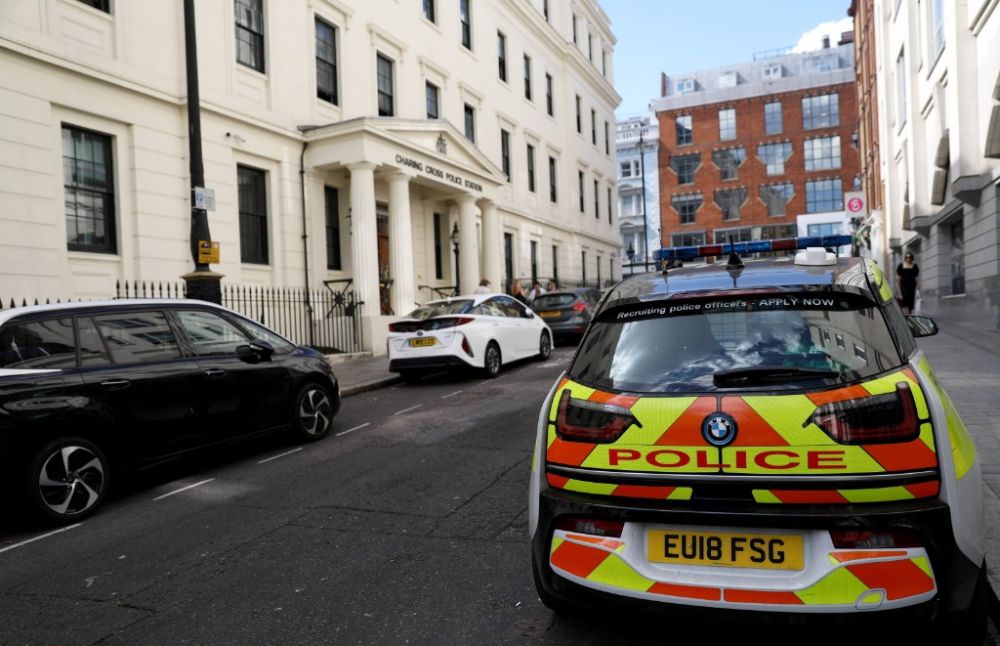 2022年8月8日,在英国伦敦,一辆警车停在警察局门口。新华社记者 李颖 摄