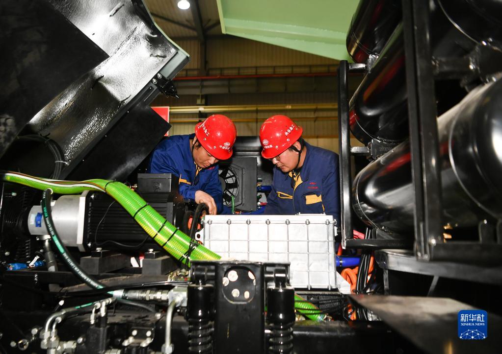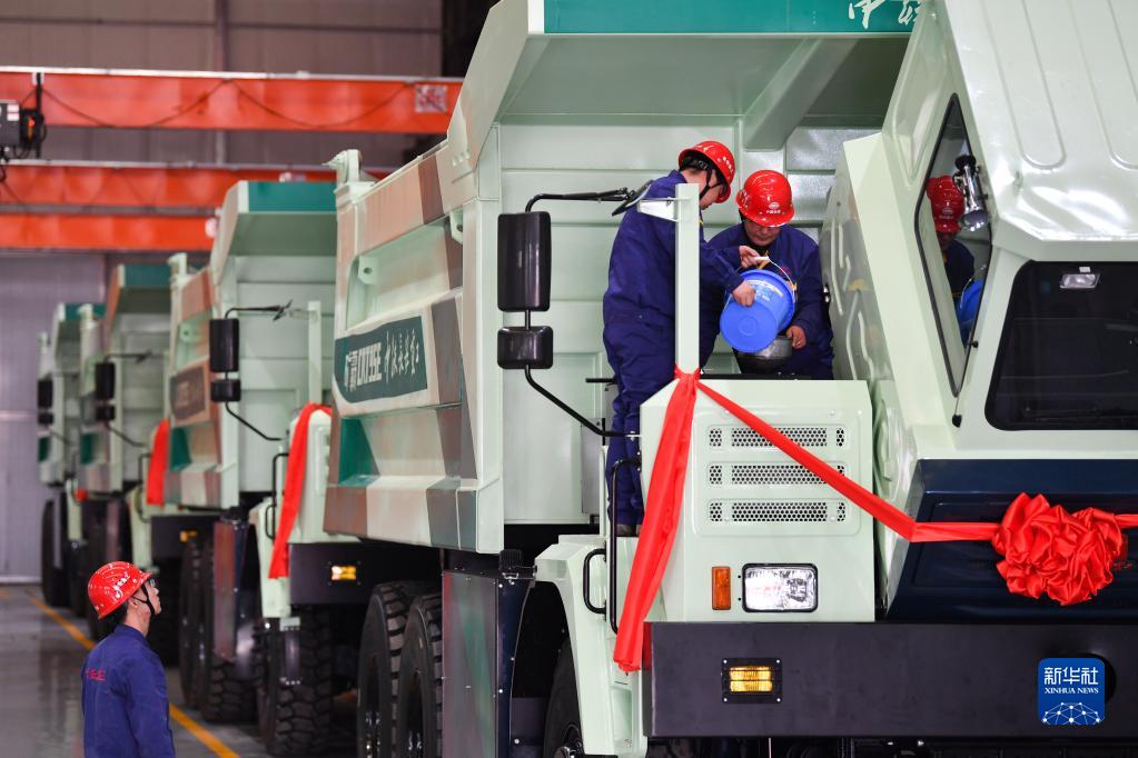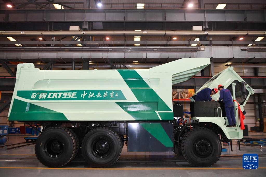3月22日,中铁长安重工有限公司的工人在生产线上调试即将下线的95吨纯电动矿用自卸车。新华社记者 张博文 摄