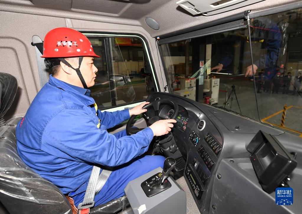 3月22日,中铁长安重工有限公司的工人在生产线上试乘即将下线的95吨纯电动矿用自卸车。新华社记者 张博文 摄
