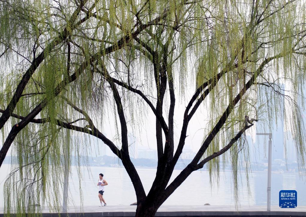 3月14日,在山东省临沂市兰山区,市民在沂河岸边柳树下晨跑健身。新华社发(许传宝 摄)