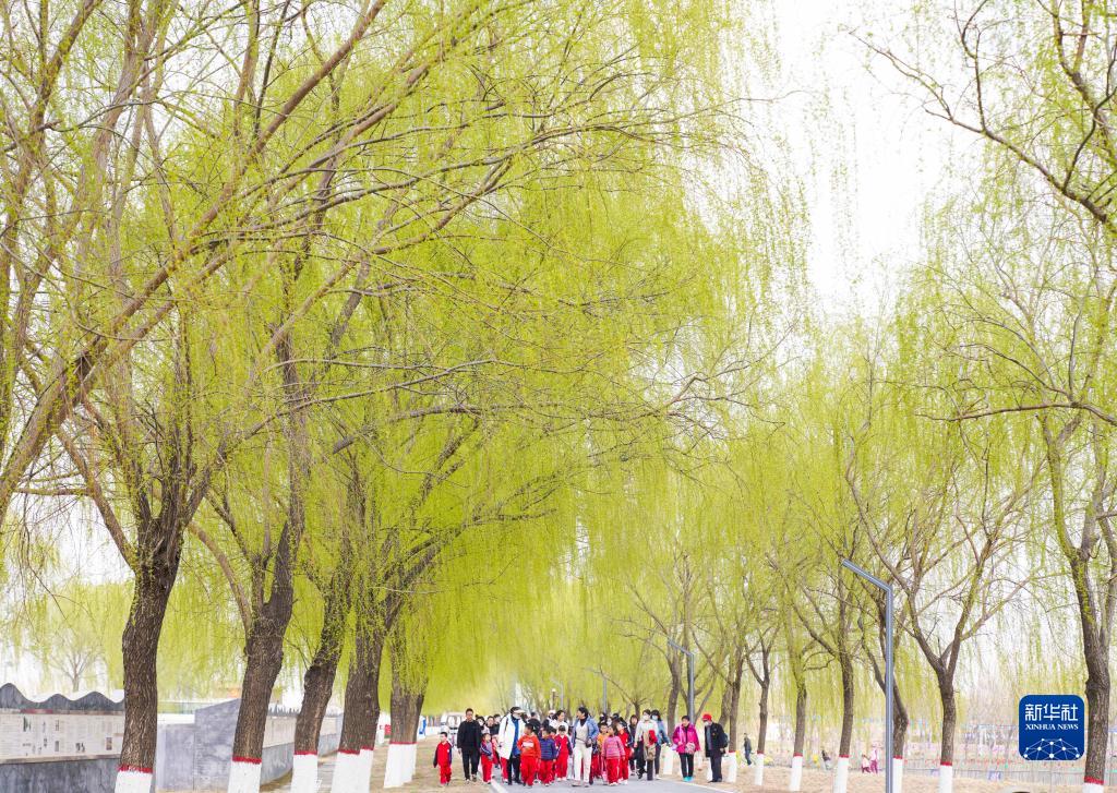 3月18日,山东省邹平市第二实验小学的学生在黄河台子段大堤上赏柳游玩。新华社发(董乃德 摄)