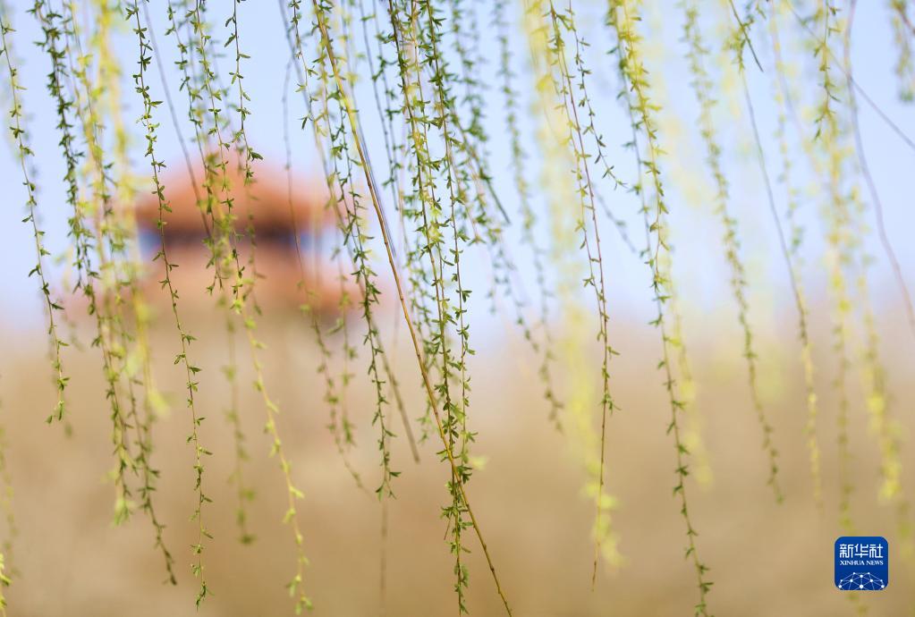 3月22日,游客在甘肃省敦煌市鸣沙山月牙泉景区游览,景区柳树吐出新绿。新华社发(张晓亮 摄)