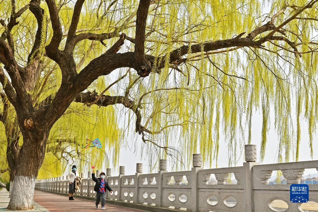3月22日,小朋友在山东省烟台市福山区清洋河畔柳树下玩耍。新华社发(孙文潭 摄)