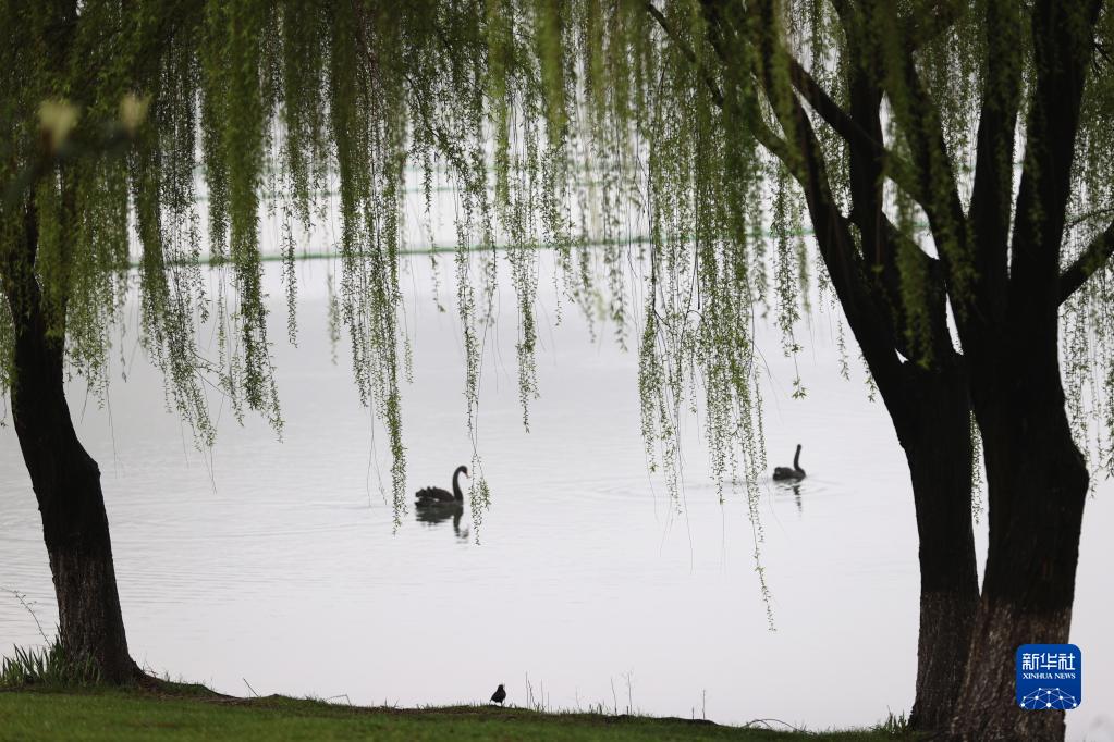 3月22日,浙江省湖州市吴兴区西山漾国家城市湿地公园的柳树吐出新芽,黑天鹅在水中嬉戏。新华社发(何伟卫 摄)