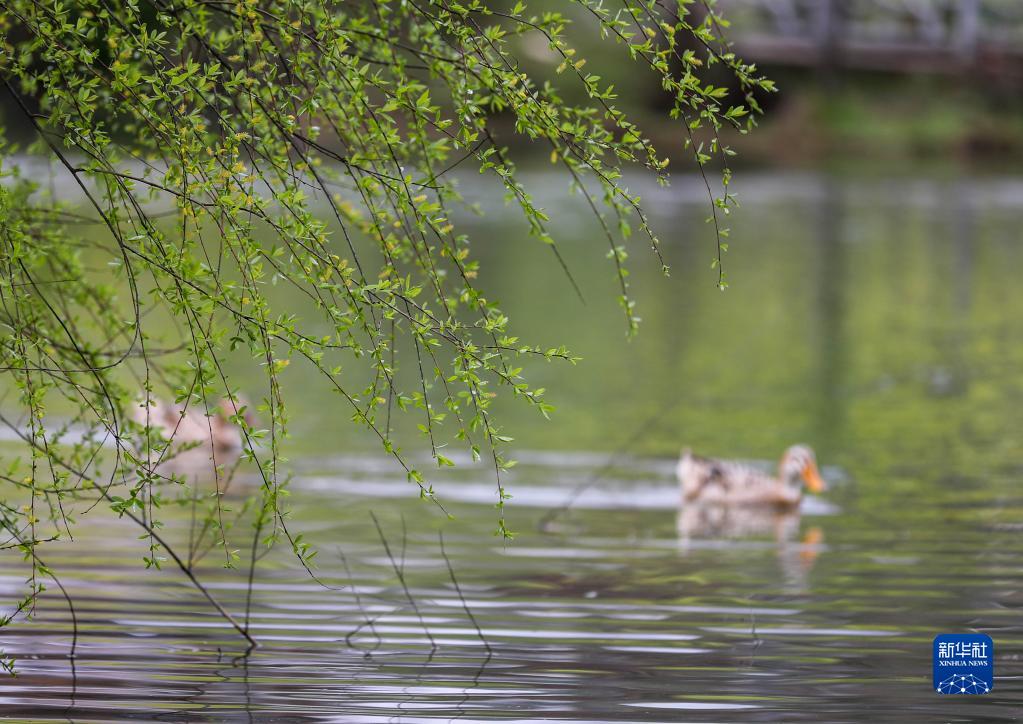 3月22日,在贵州省遵义市余庆县子营街道余庆河畔,一只野鸭从柳树下游过。新华社发(周磊 摄)