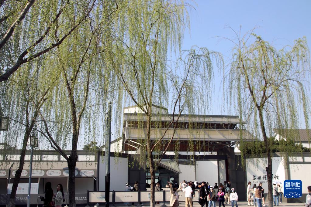 3月15日,游客从江苏苏州博物馆旁的垂柳下经过。新华社发(王建康 摄)