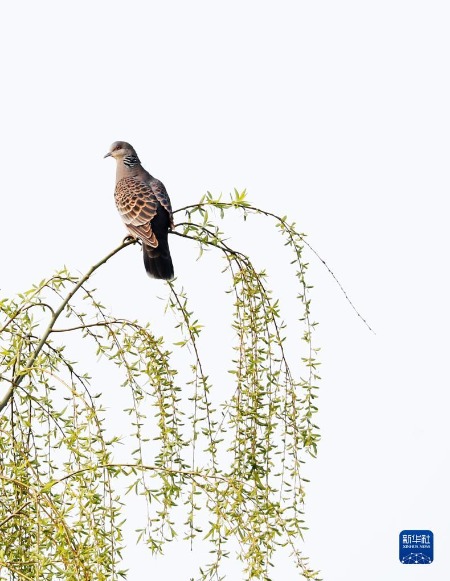 3月19日,在山东省临沂市郯城县白马河湿地公园,一只小鸟在柳树枝上停留。新华社发(张春雷 摄)