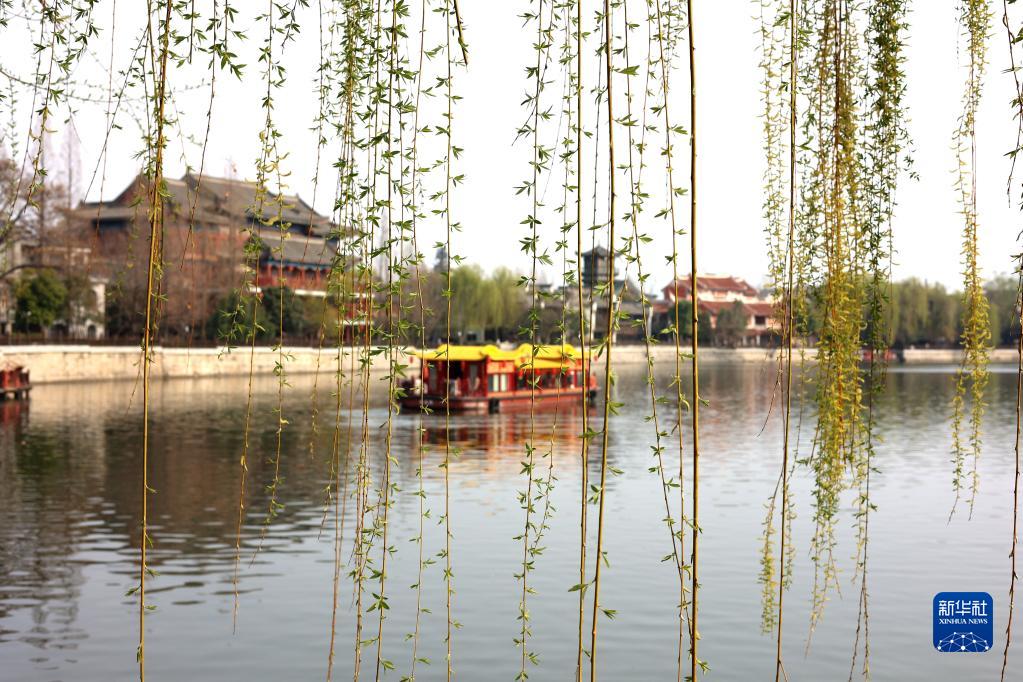 3月20日,游客在垂柳环绕的济南趵突泉景区游玩。新华社发(徐舟 摄)