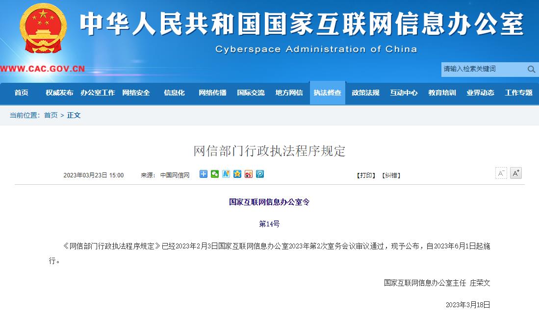 《网信部门行政执法程序规定》已经2023年2月3日国家互联网信息办公室2023年第2次室务会议审议通过,现予公布,自2023年6月1日起施行。