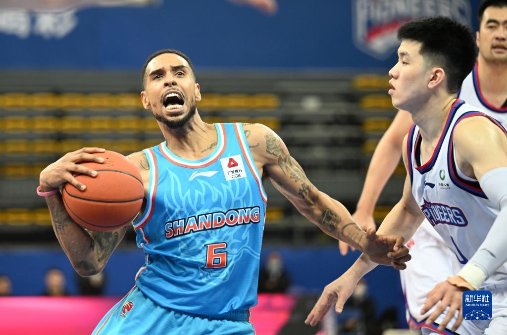 3月22日,山东高速队球员兰兹博格(左)在比赛中突破。新华社记者 赵子硕 摄