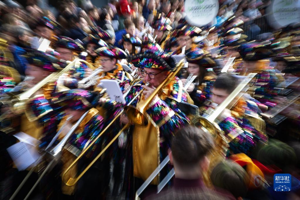 3月19日,在比利时东部的小城斯塔沃洛,乐手在狂欢节游行上演奏。