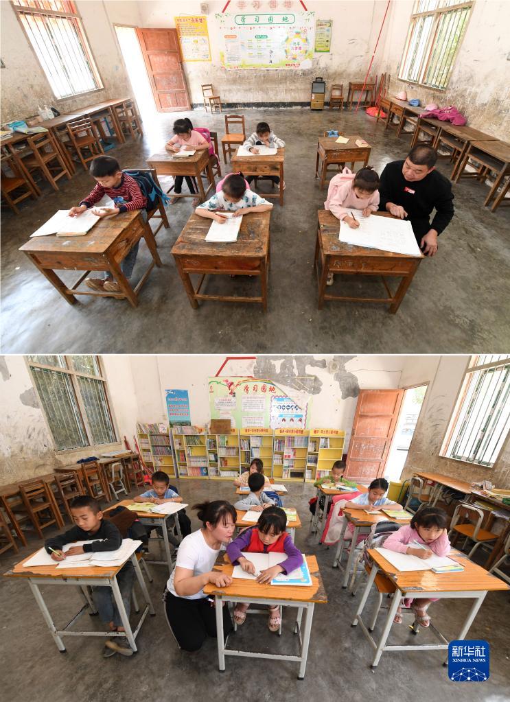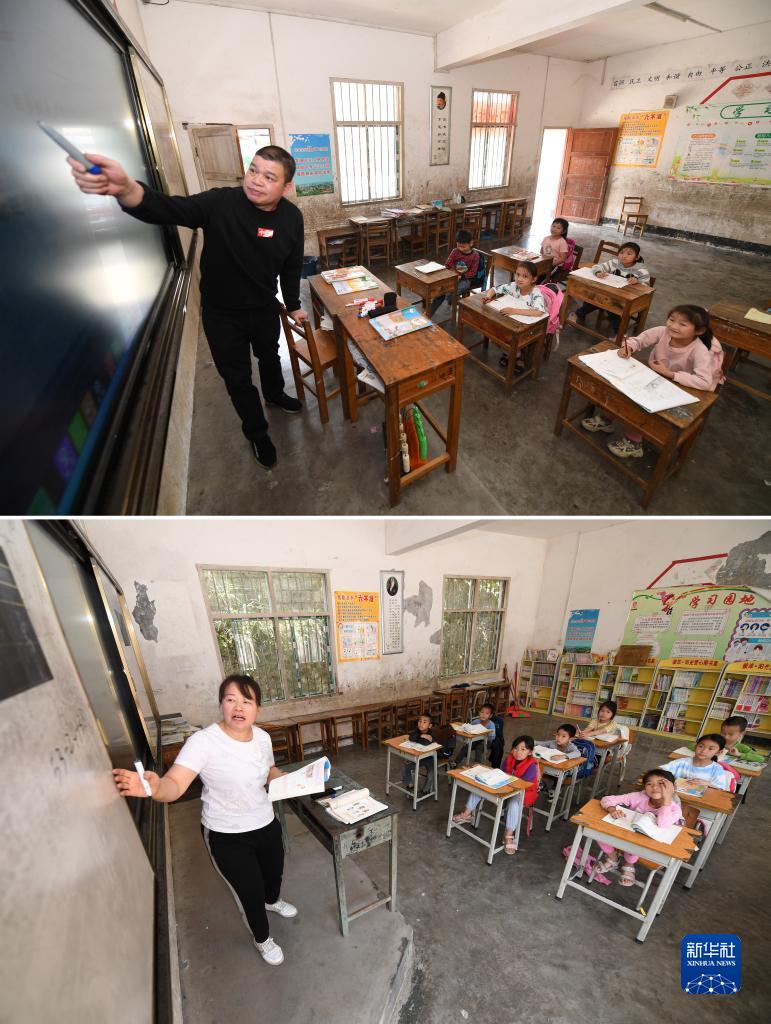 这是一张拼版照片:在广西德保县东凌镇那王小学,黄永勇(上图)和黄秀碧(下图)在给学生上课(3月22日摄)。