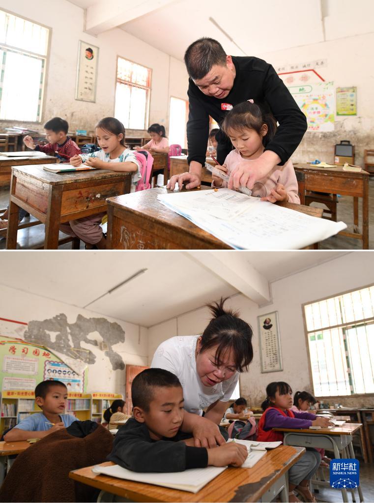 这是一张拼版照片:在广西德保县东凌镇那王小学,黄永勇(上图)和黄秀碧(下图)在课堂上辅导学生功课(3月22日摄)。
