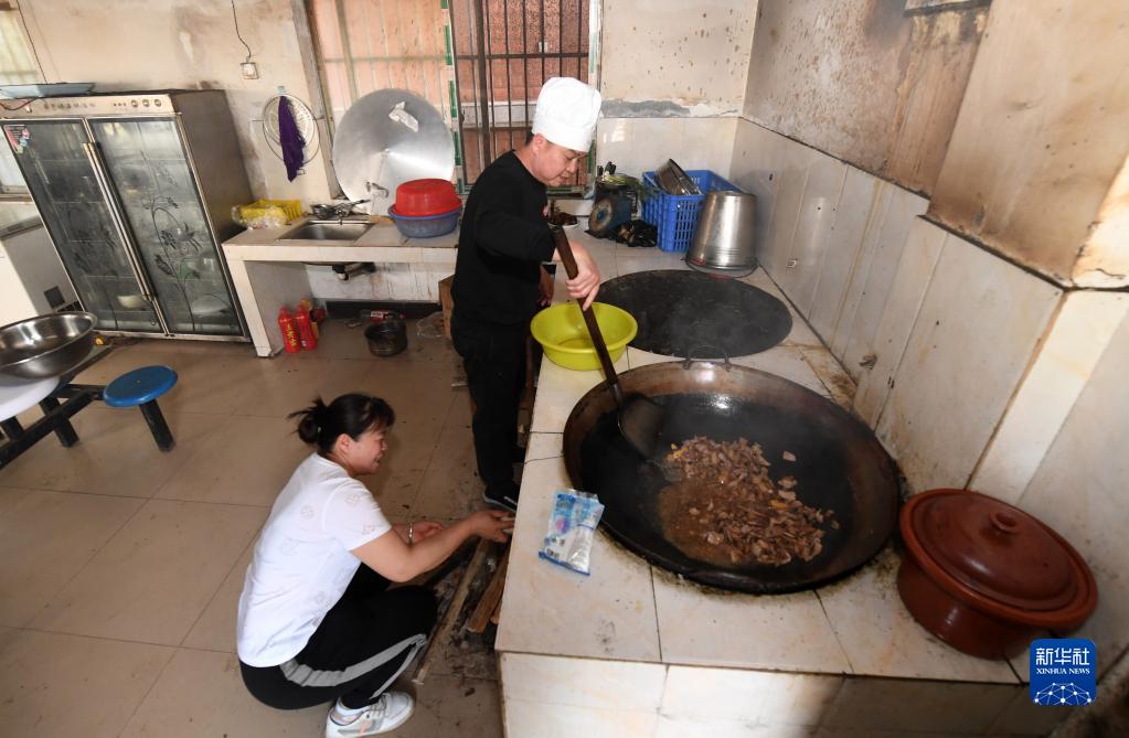 在广西德保县东凌镇那王小学,黄永勇(右)和黄秀碧在给学生做午餐(3月22日摄)。