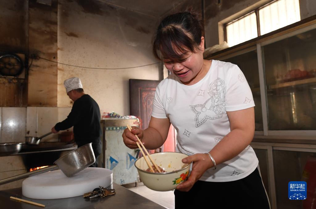 在广西德保县东凌镇那王小学,黄秀碧(右)和黄永勇在给学生做午餐(3月22日摄)。