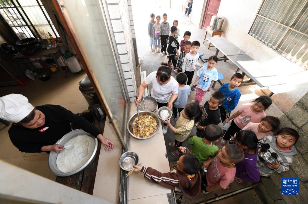 在广西德保县东凌镇那王小学,黄永勇(左一)和黄秀碧在给学生分午餐(3月22日摄)。