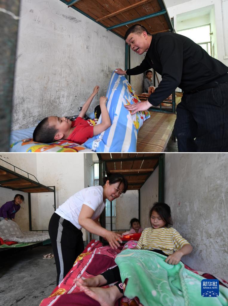 这是一张拼版照片:在广西德保县东凌镇那王小学,黄永勇(上图)和黄秀碧(下图)在照顾学生午休(3月22日摄)。