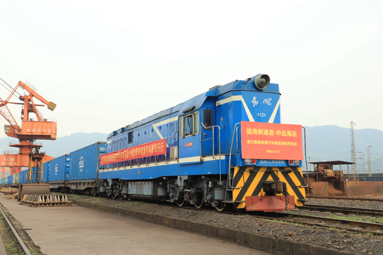 这是重庆开出的西部陆海新通道首列新能源汽车铁海联运班列,将为成渝地区双城经济圈新能源汽车出口添新通道。
