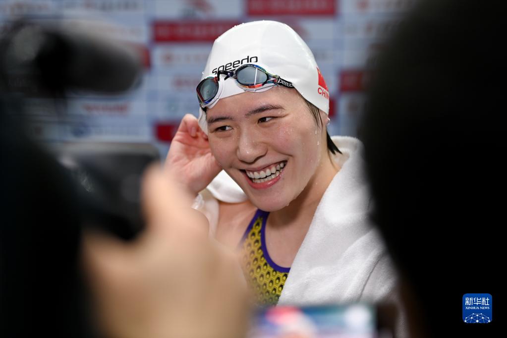3月23日,浙江队选手叶诗文在女子200米蛙泳决赛后接受采访,她以2分24秒01的成绩获得冠军。新华社记者 夏一方 摄