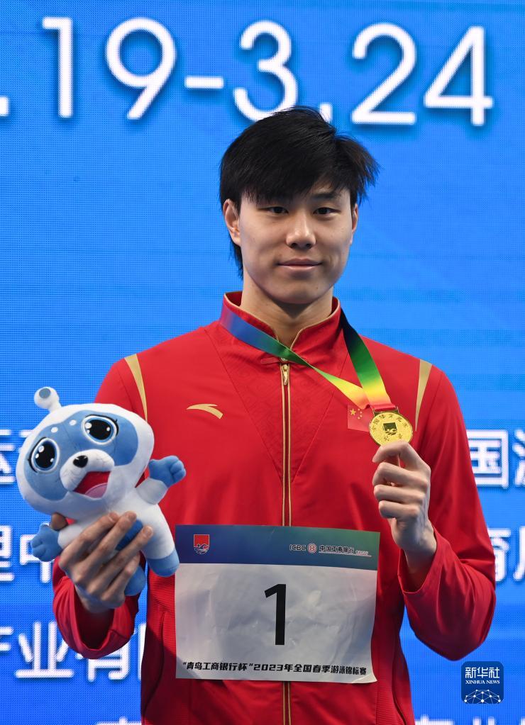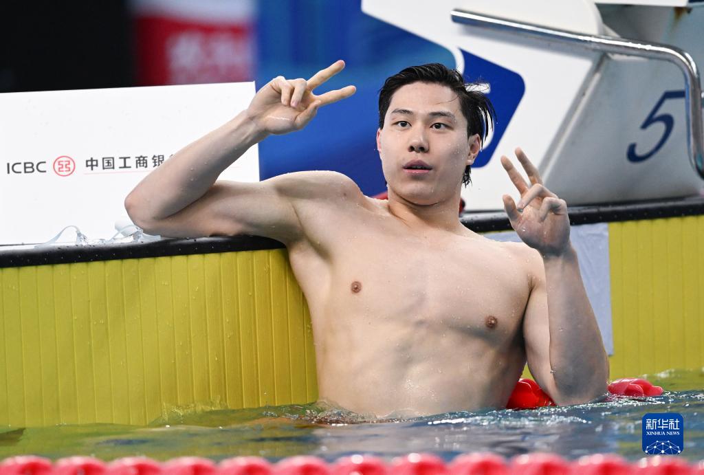 3月23日,天津队选手王长浩在男子50米蝶泳决赛后,他以23秒25的成绩获得冠军。新华社记者 雒圆 摄