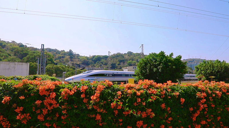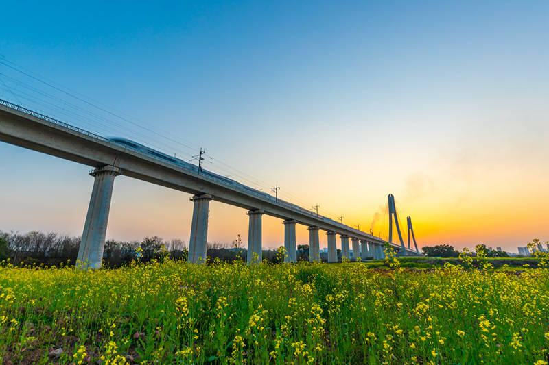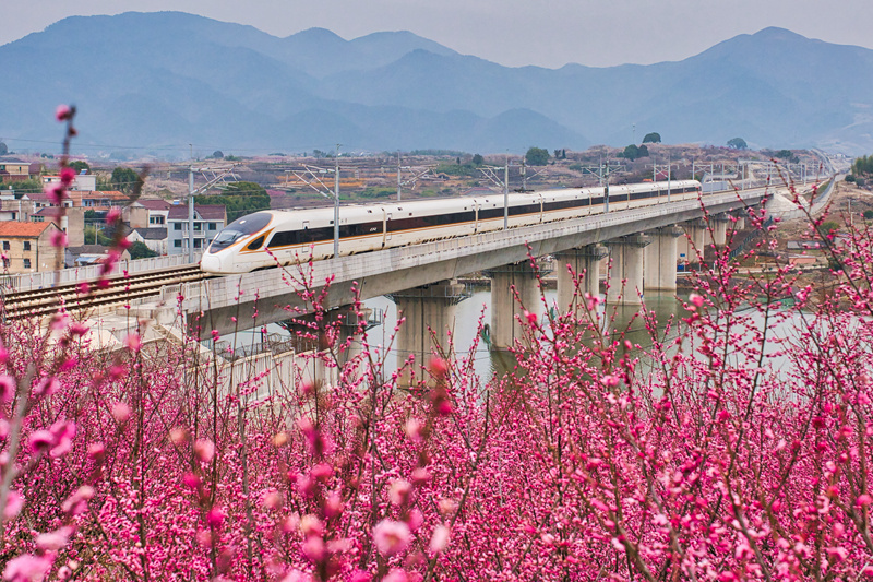高铁在花海中追着春天。中国铁路南昌局集团有限公司供图