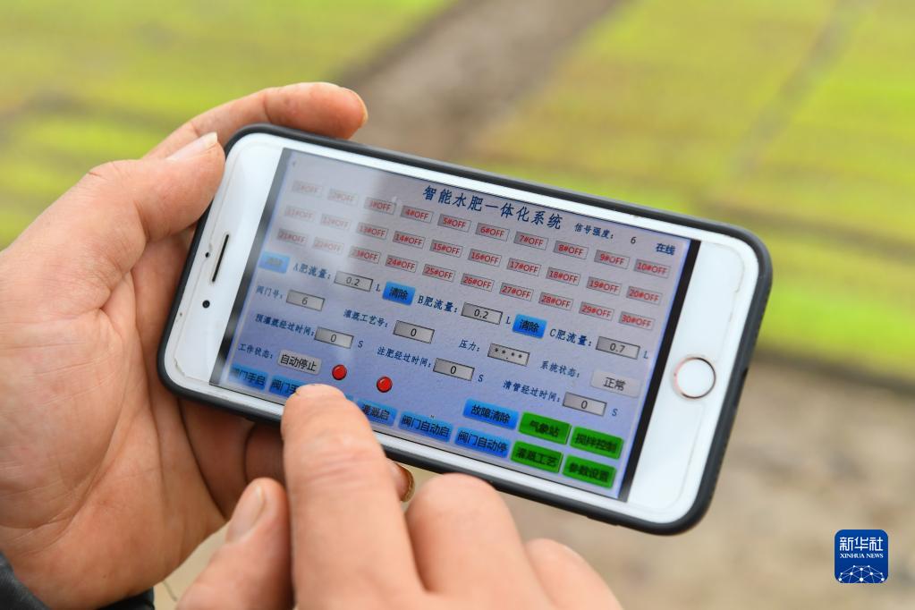 3月23日,在湘潭市雨湖区姜畲镇青亭村一处多功能育秧大棚里,农民在手机上设置智能水肥一体化系统。新华社记者 陈泽国 摄