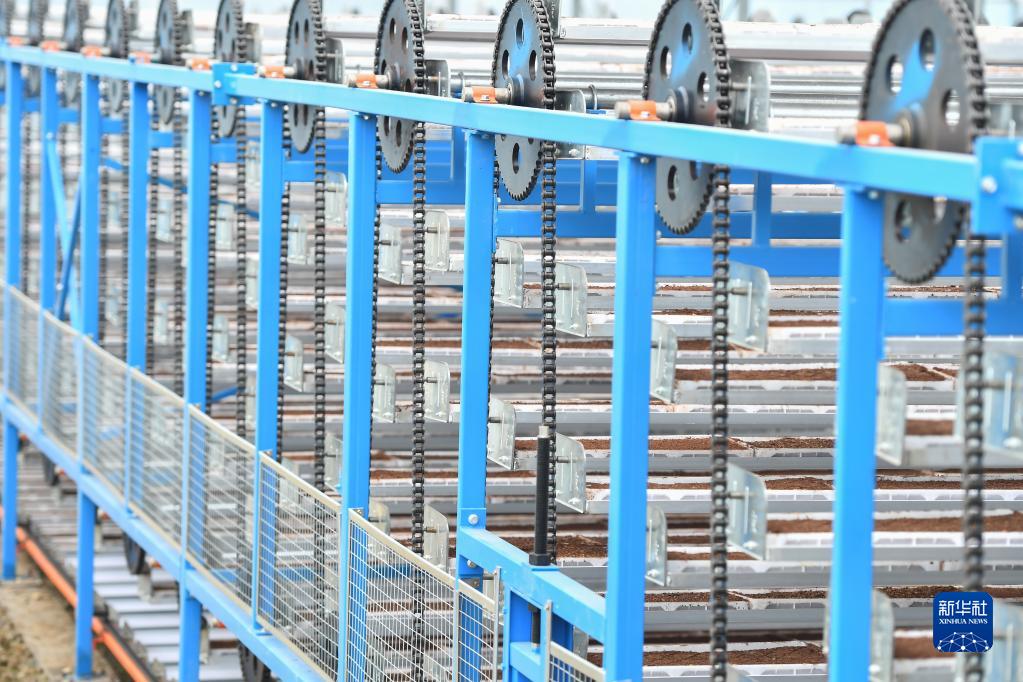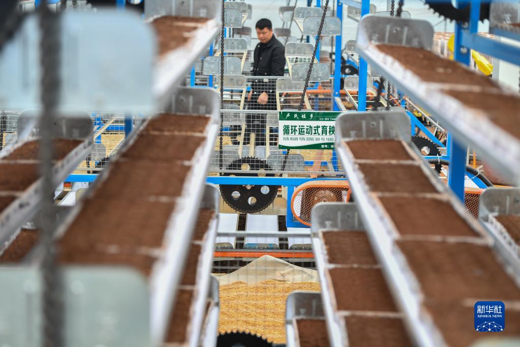 3月23日,在湘潭市雨湖区姜畲镇青亭村一处多功能育秧大棚里,循环运动式育秧机在作业。新华社记者 陈泽国 摄