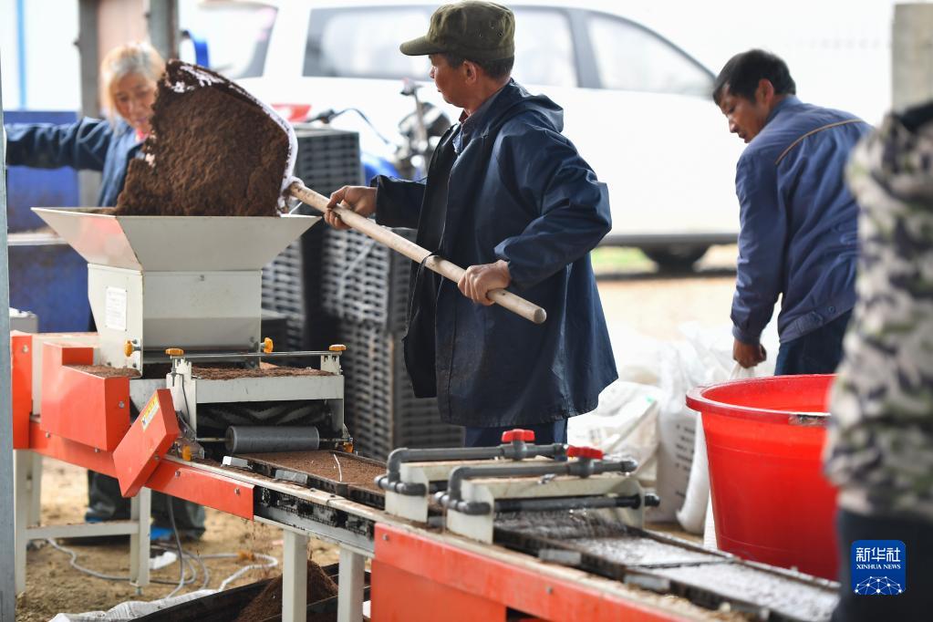 3月23日,在湘潭市雨湖区姜畲镇青亭村,农民使用水稻秧盘育秧播种机制作秧盘。新华社记者 陈泽国 摄
