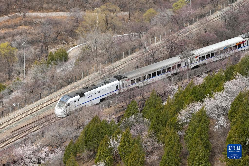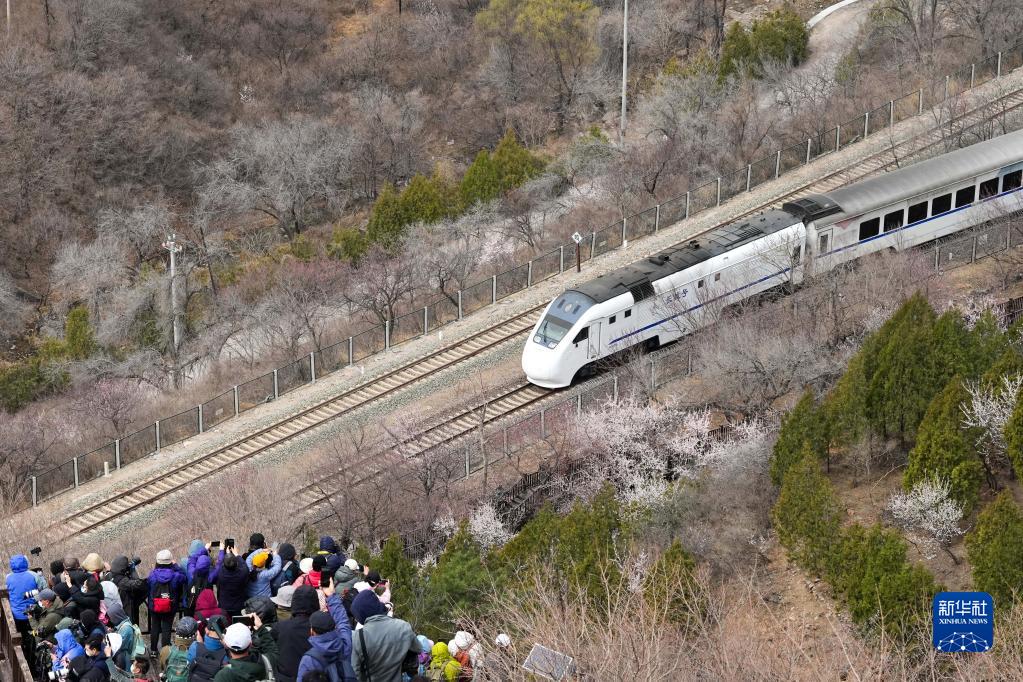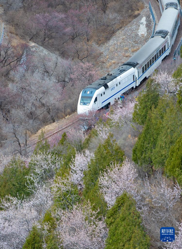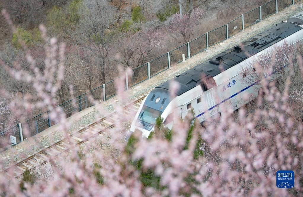 近日,北京居庸关长城脚下山花渐次开放。北京市郊铁路S2线列车穿行于花海间,成为春日里一道美丽的风景。