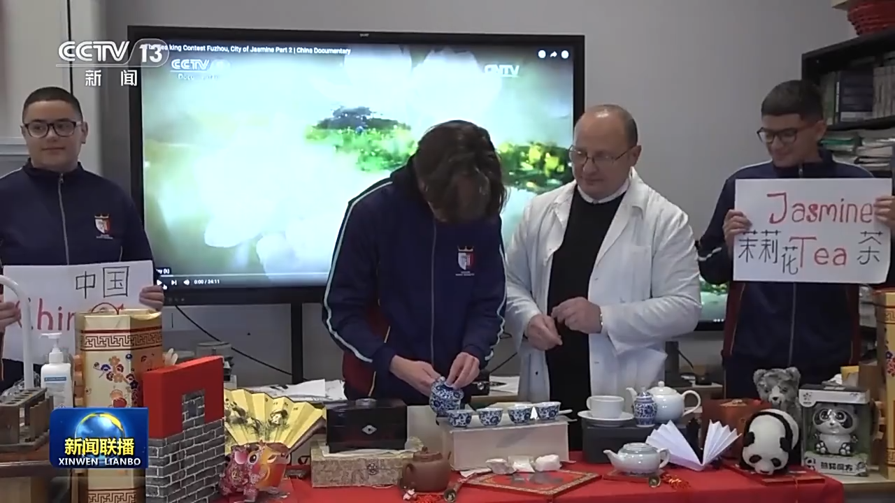 青花瓷杯,茉莉花茶,马耳他圣玛格丽特中学的“中国角”,同学们在沏茶和品鉴中体验中国茶道。这一小小“中国角”,已成为当地学生了解中国的一扇窗。创办者阿佐帕迪老师,去年代表师生们给习近平主席写信,他引用《礼记》中“圣人耐以天下为一家”,表达对人类命运共同体理念的认同。