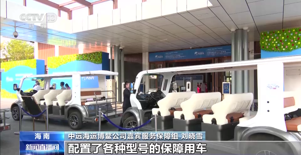 中远海运博鳌公司嘉宾服务保障组 刘晓雪:同时在车辆保障方面,今年的会议保障车辆首次全部使用了新能源汽车,我们结合参会嘉宾的数量,配置了各种型号的保障用车,方便嘉宾出行。