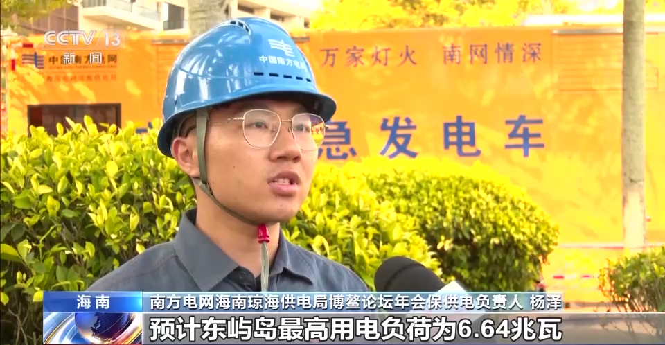 南方电网海南琼海供电局博鳌论坛年会保供电现场工作组负责人 杨泽:年会期间,预计东屿岛最高用电负荷为6.64兆瓦,最高用电量为23.61万千瓦时。比传统供电相当于减少标煤燃烧75吨以上,减排二氧化碳排放234吨以上。
