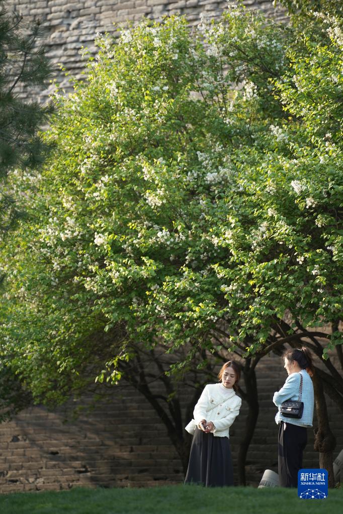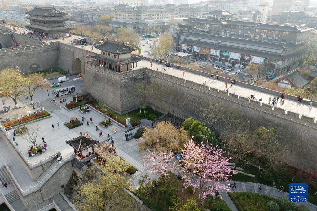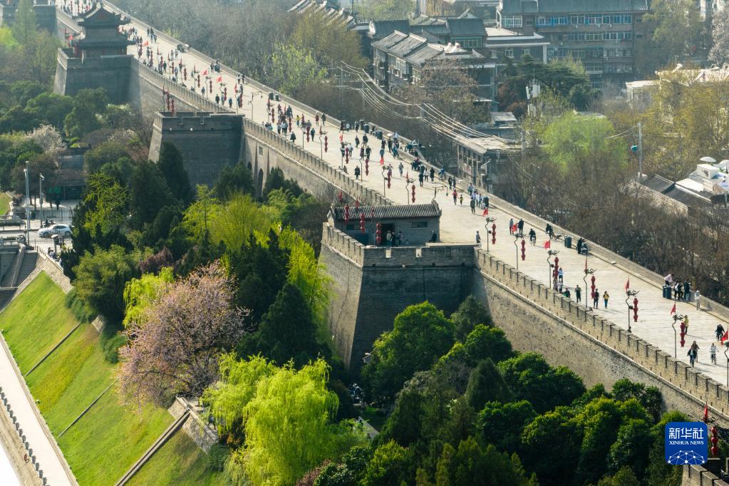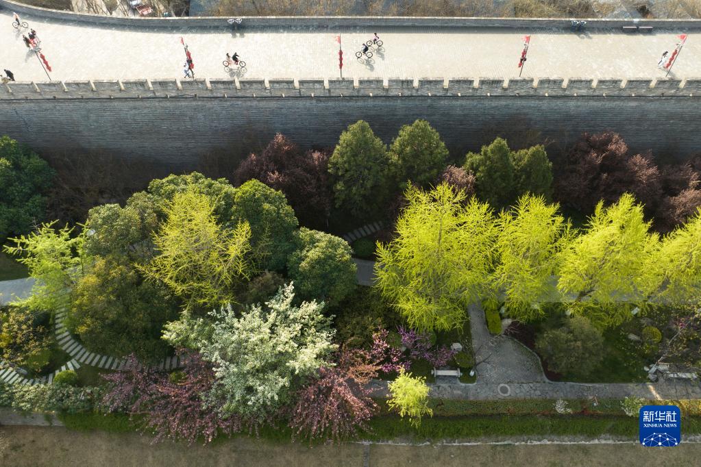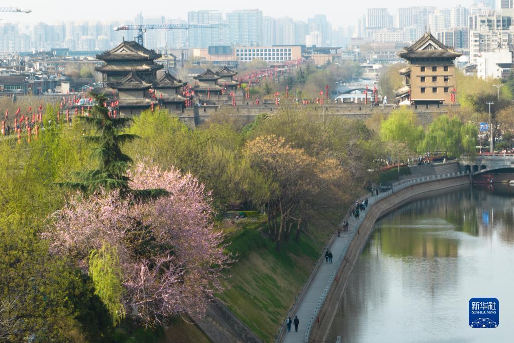 近日,陕西西安明城墙旁春意渐浓,吸引不少市民游客前来踏青。