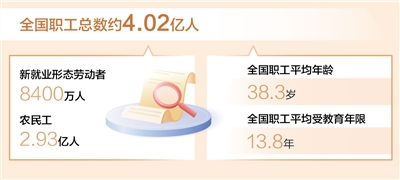 人民日报北京3月26日电 (记者易舒冉)记者日前从中华全国总工会获悉:第九次全国职工队伍状况调查已于近期结束,调查表明,目前全国职工总数4.02亿人左右,新就业形态劳动者8400万人,农民工2.93亿人;职工平均年龄38.3岁、平均受教育年限13.8年。调查还显示,职工理想信念更加坚定,主人翁地位持续巩固,越来越多的职工积极投身“当好主人翁、建功新时代”“建功‘十四五’、奋进新征程”等主题劳动和技能竞赛。