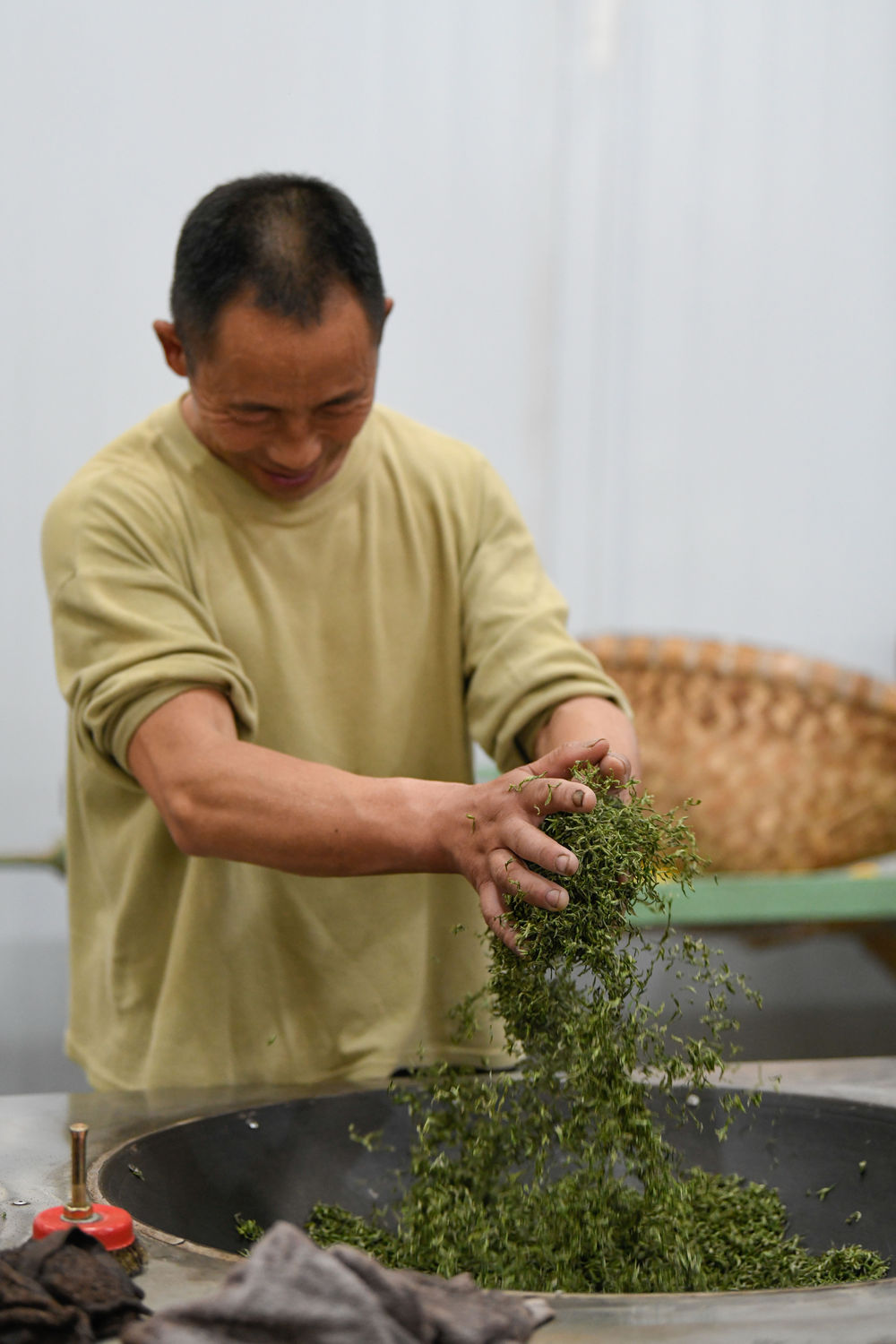 走进四川茗凡茶业有限公司的车间,十口大锅分成两排,每口锅中有两斤已经完成了揉捻的茶叶,需要人工“贴锅”。52岁的李军文是有着20多年制茶经验的老师傅,他熟练地用手重复着翻动和轻压的动作,带着规律的节奏感。十来分钟便完成一锅茶叶的“贴锅”。