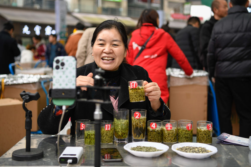 一位茶商在世界茶都茶叶交易市场内进行直播,为网友介绍自家茶叶特色。新华社记者 胥冰洁 摄