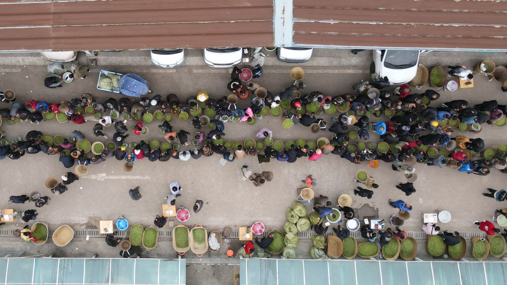 雅安市名山区双河鲜叶交易市场内,茶农与茶企在进行鲜叶交易(无人机照片)。新华社记者 胥冰洁 摄