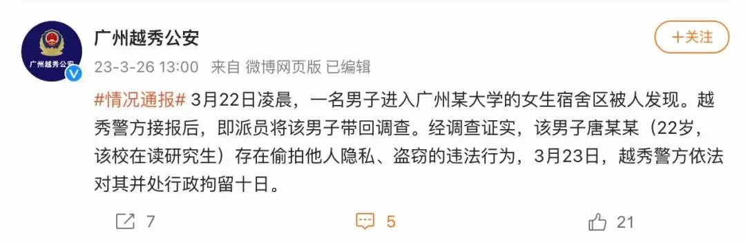 3月26日,广州越秀公安微博发布一情况通报称,3月22日凌晨,一名男子进入广州某大学的女生宿舍区被人发现。警方接报后,即派员将该男子带回调查。