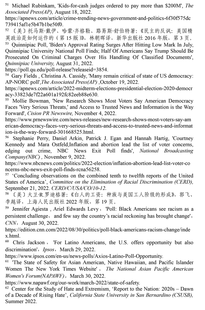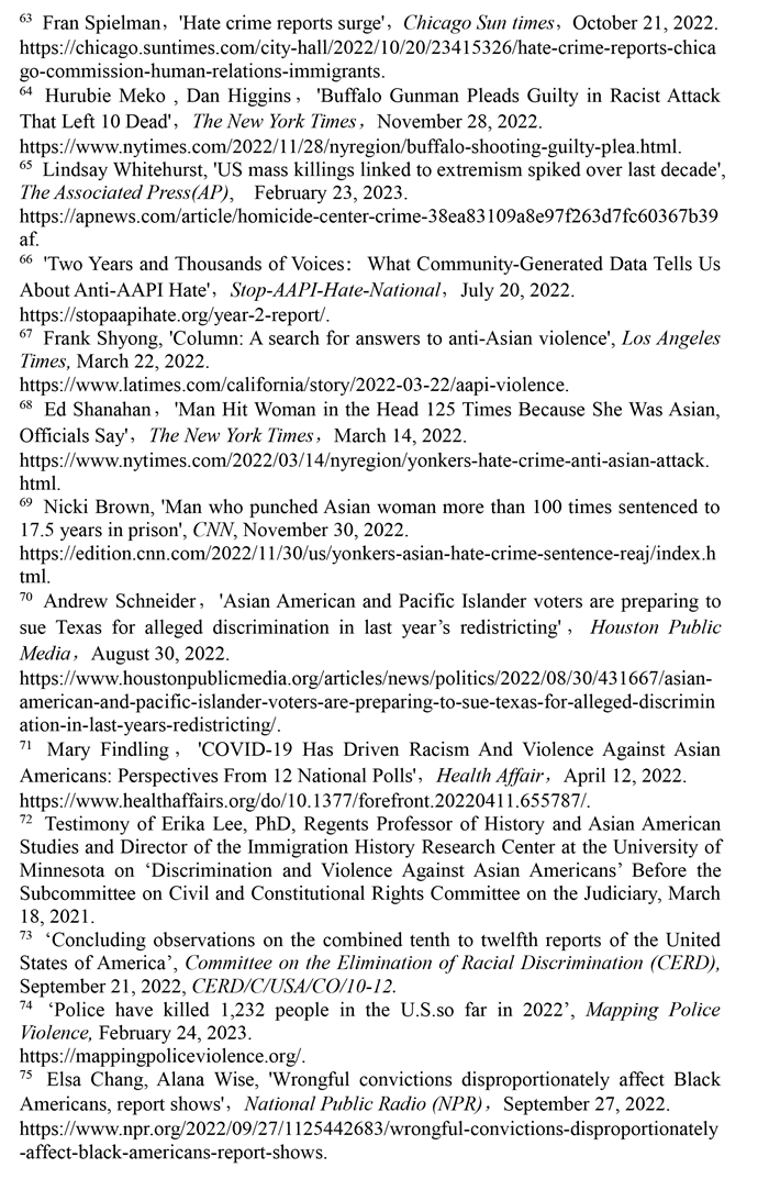 联合国消除种族歧视委员会2022年9月21日发布的关于审议美国履行《消除一切形式种族歧视国际公约》情况的结论性报告指出,美国历史上殖民主义和奴隶制留下的阴影至今仍挥之不去,助长着美国社会流行的种族主义。近几年来,美国仇恨犯罪和仇恨言论事件显著增加,与种族有关的枪支死伤人数大幅增加,有色人种和少数族裔在医疗、教育、住房等领域持续面临系统性歧视。(注57)
