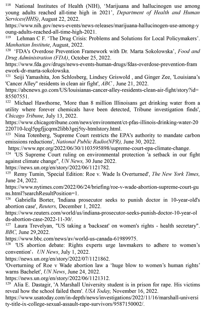 治理缺位危害环境权。美国广播公司2022年6月21日报道,在路易斯安那州,大量排放的工业废料致使密西西比河沿岸出现诸多“癌症巷”地区,该地区民众因空气污染而患癌的风险较美国其他地区高出95%。(注121)《芝加哥论坛报》2022年7月13日报道,在伊利诺伊州,占当地人口约60%的逾800万居民的饮用水中,检测到至少含一种可能有损健康的“永久性化学物质”。(注122)在环境形势日趋恶化的背景下,美国联邦最高法院却于2022年6月裁定,美国环境保护局无权在未得到美国国会授权的条件下,在州层面限制温室气体排放量,也不得要求发电厂放弃化石燃料转用可再生能源。(注123)联合国秘书长发言人杜加里克指出,美国联邦最高法院的这一裁决,是“全球应对气候变化的一次挫折”。(注124)