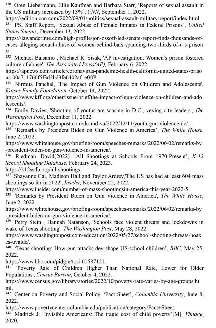 妇女堕胎失去宪法保护,儿童生存环境令人担忧。美国联邦最高法院推翻“罗伊诉韦德案”的裁决终结了近50年来受宪法保护的堕胎权,是对妇女人权和性别平等的巨大打击。2022年美国有超过5800名18岁以下的儿童因枪击受伤或死亡,校园枪击事件数量高达302起,创1970年以来的最高值。美国儿童贫困率从2021年12月的12.1%上升至2022年5月的16.6%,增加了330万贫困儿童。2018年以来被非法雇用的童工激增近70%,2022财年受雇专门从事危险工作的儿童增加了26%。