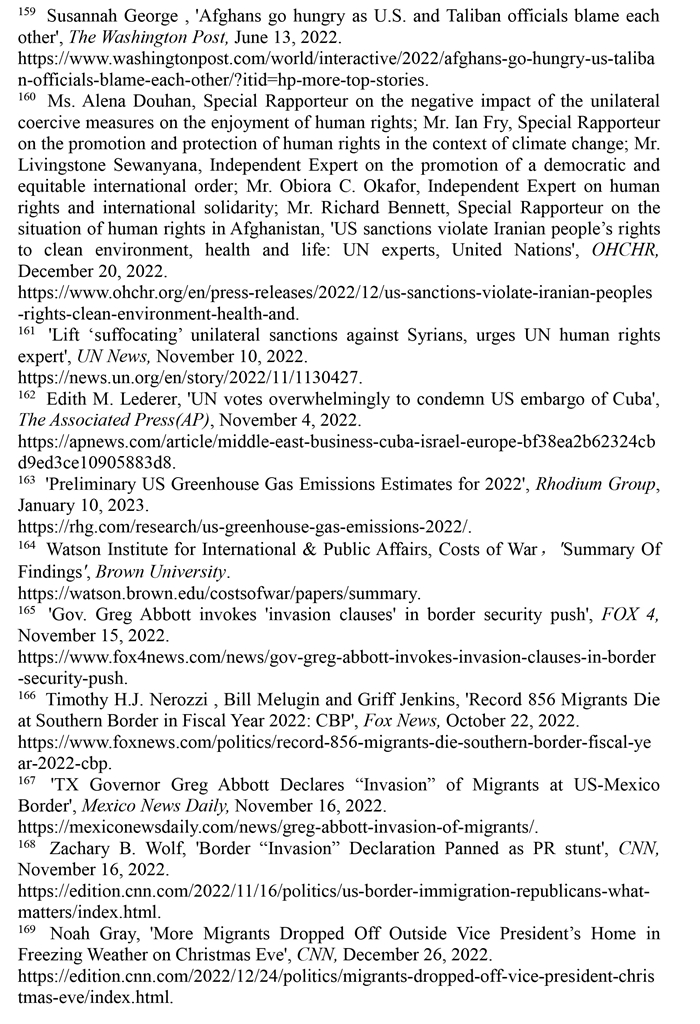 长期肆意实施单边制裁。近年来,美国对其他国家实施的单边制裁呈指数级增长,极大削弱了被制裁国家人权保障的能力与水平。孟加拉国《每日星报》2022年12月28日报道,美国实施的单边制裁总数为世界之最,目前仍在对20多个国家实施制裁,包括1962年以来对古巴的制裁、1979年以来对伊朗的制裁、2011年以来对叙利亚的制裁,以及近年来对阿富汗的制裁,导致被制裁国家无法向其人民提供基本的食物和药品。(注158)《华盛顿邮报》2022年6月13日报道,近一半的阿富汗人没有足够的食物,儿童营养不良呈上升趋势。(注159)2022年12月20日,多名联合国人权理事会独立专家发表共同声明指出,美国政府对伊朗的制裁加剧了伊朗的环境危害,使所有在伊朗的民众无法充分享受健康权和生命权,侵犯了伊朗人民享有清洁环境的权利。(注160)联合国单边强制措施对人权负面影响问题特别报告员阿莱娜·杜晗2022年11月10日指出,单边制裁加剧了叙利亚人民的苦难,是对人权的严重侵犯。(注161)美国政府肆意实施制裁引发他国人权危机受到国际社会强烈谴责。2022年11月3日,联合国大会就敦促美国终止对古巴的经济、商业和金融封锁进行投票表决。在193个成员国中,多达185个国家支持谴责美国对古巴的禁运。(注162)这是联合国大会连续30次通过类似决议。